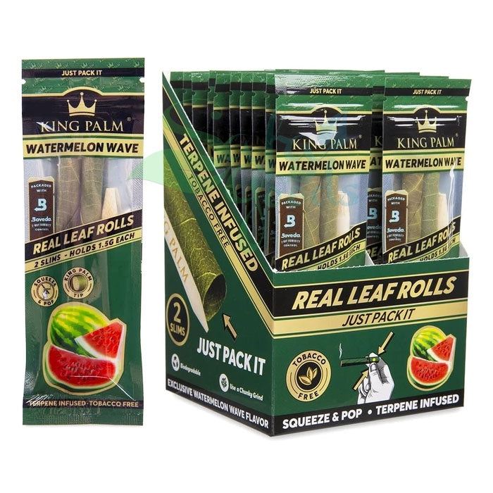 Each King Palm watermelon wave mini rolls come with 2 slim rolls per pack with 20 packs per display. They come pre-rolled already so no need to worry about rolling this up. These are made from natural Cordia (Borage) leaf rolls.